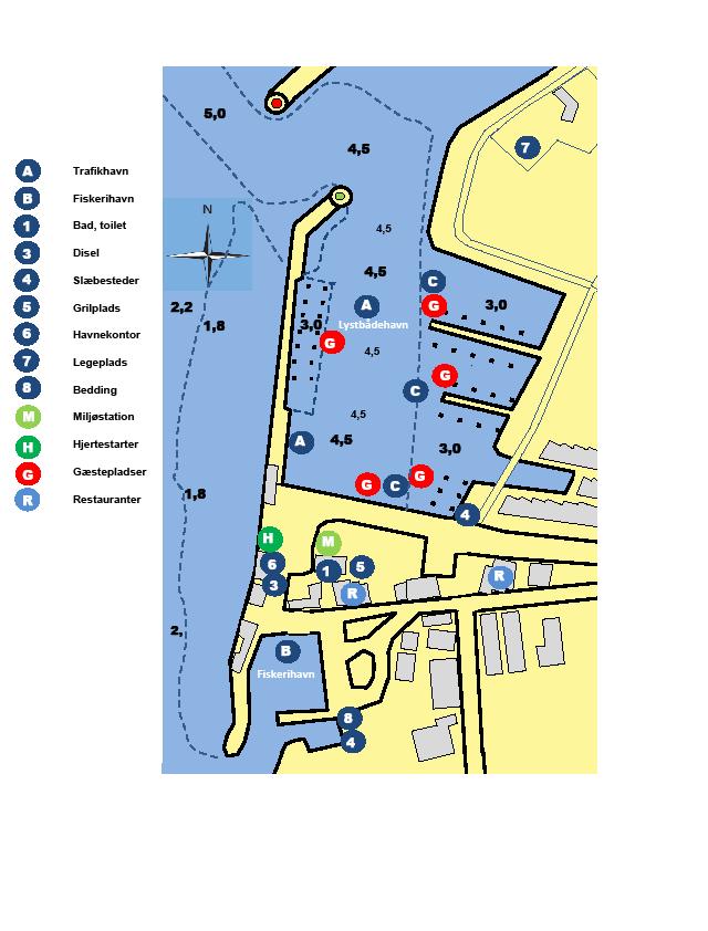 Vanddybderne i både Trafik- og Lystbådehavnen fremgår af det tilhørende kort over havneområdet.